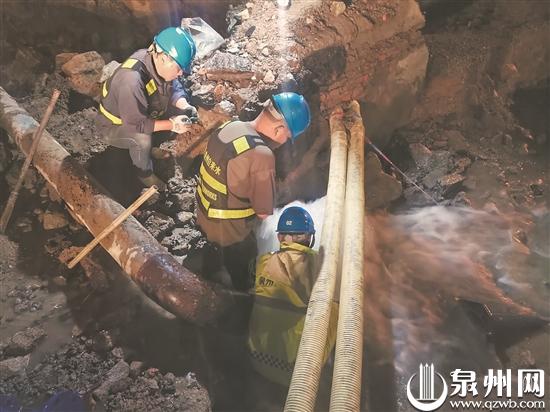 工作人员抢修被施工挖破的水管泉州自来水公司20日下午5时20分发出的停水公告显示:因通港东街(东海立交至后渚大桥)快捷化改造工程施工中挖破我司DN800预留口,现需停通港东街DN800主阀进行维修。停水区域:后亭社区、森林公园、莲安村、后渚码头、延年山庄、海警二支队、海星小区、海星小区扩建一期、泉州一中东海校区、市行政服务中心、晋光小学东海校区、香槟维港城、滨海公园、海悦府等。为尽可能降低对用户用水影响,拟定于2023年4月21日00:00—04:00停水维修。本次停水为突发性停水,给您带来的不便我司深表歉意,我们将尽力缩短停水时间,尽快恢复供水。
