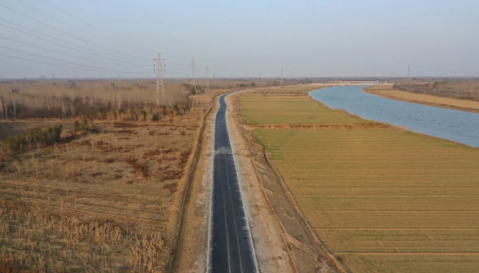 路线航拍图道路全长9.3公里,路面采用2米土路肩+6米沥青行车道+6米绿化带。项目于2021年8月中旬开工建设,历时3个月竣工完成。