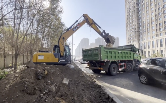 当日,永兴路人行道施工现场,钩机正在清理多余残土,工作人员表示三天后将进入铺砖阶段。全部工期预计11月12日完工。