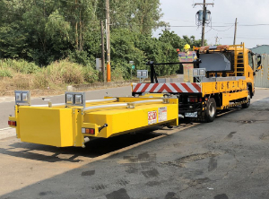 防撞缓冲车是一辆车后装有防撞缓冲垫的卡车,把它停在施工区域的后方,如果有车辆没看到施工区域追撞过来,那么防撞缓冲车的缓冲垫就可以吸收撞击能量,保障前方施工人员的安全。